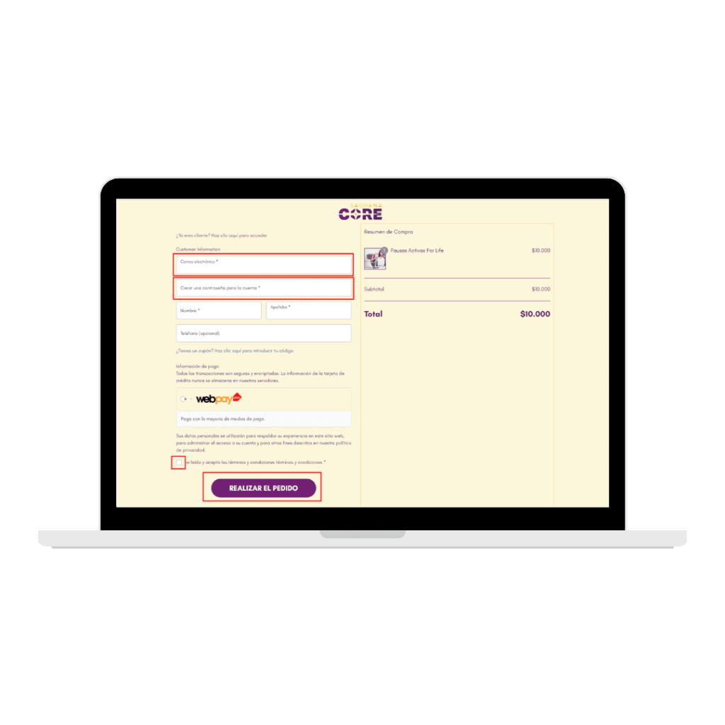Completa los datos solicitados, estos serán los mismos para iniciar sesión, guarda en un lugar seguro tu clave y dale al botón realizar pedido.